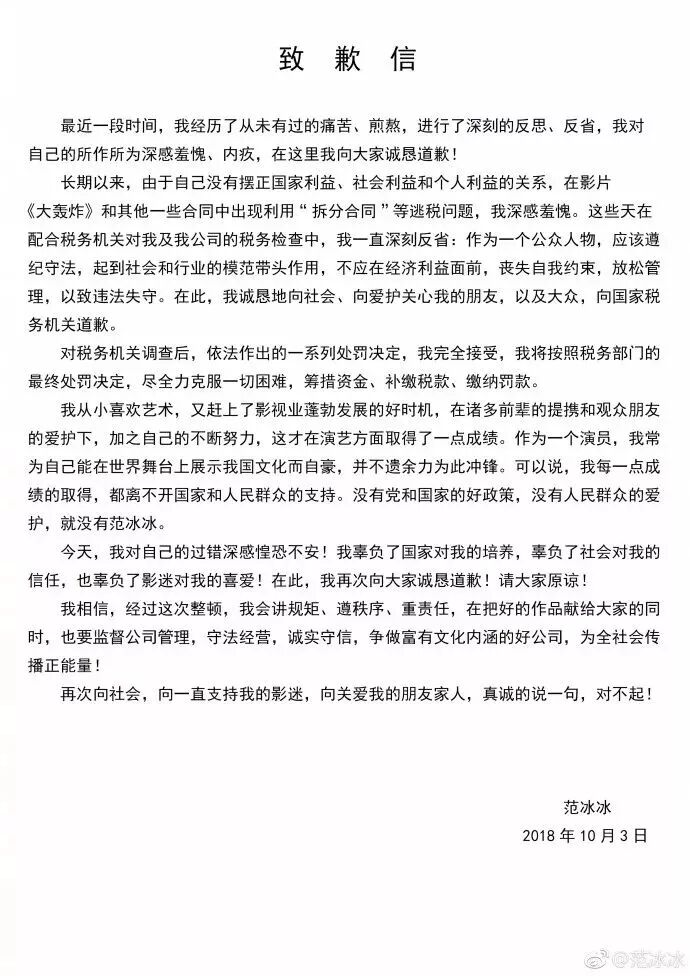 ▲范冰冰发表致歉信 图片来源:范冰冰微博截图。