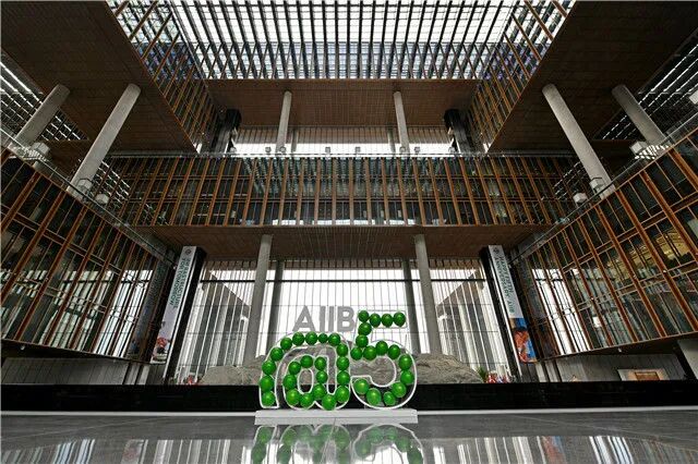 ▲ 这是亚投行总部大楼内景和庆祝正式开业五周年装饰(2021年1月13日摄)。新华社记者 李鑫 摄