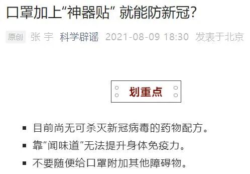 去年8月,由中国科协、卫生健康委等官方机构共同创办并运营的媒体“科学辟谣”,在一篇题为《口罩加上“神器贴” 就能防新冠?》的文章中明确指出: