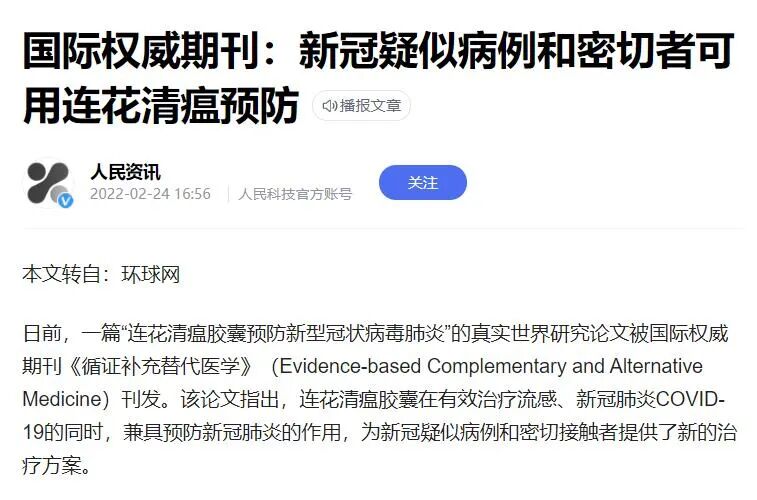 先是所谓的【“连花清瘟胶囊预防新型冠状病毒肺炎”的真实世界研究论文被国际权威期刊《循证补充替代医学》刊发】: