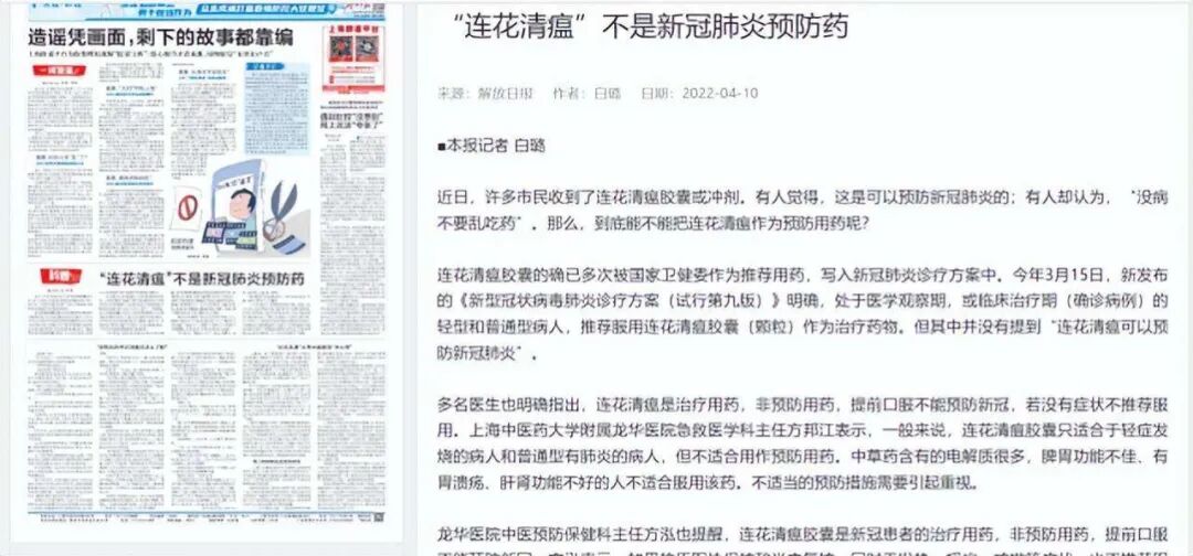 除了钟南山院士的发言,2022年4月10日版的解放日报也发文称:“连花清瘟”不是新冠肺炎预防药。