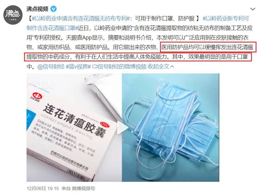 一则是以岭药业申请的“含有连花清瘟提取物的纺粘无纺布的制备工艺及应用”专利获授权。