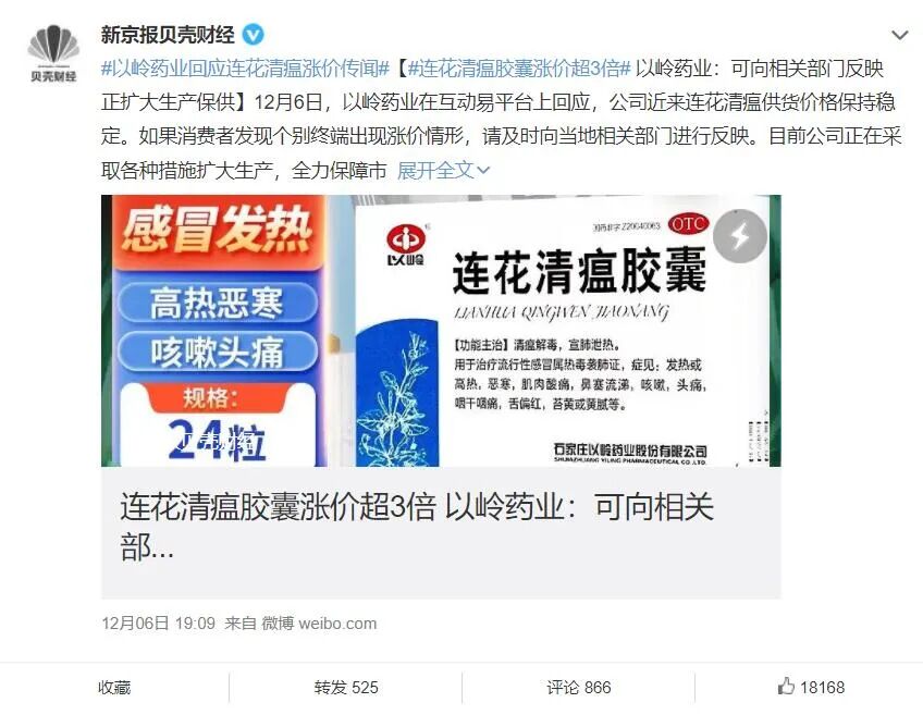 另一新闻,则是以岭药业生产的连花清瘟胶囊涨价超3倍。