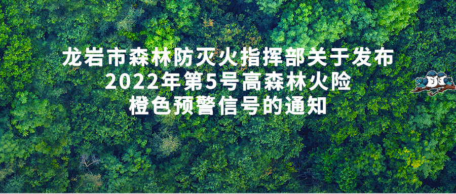 为全面贯彻落实省政府第三季度防范重特大生产安全事故会议、全市安全生产和社会稳定视频会议精神,根据《福建省森林防灭火指挥部关于发布2022年第2号高森林火险橙色预警信号的通知》(闽森防指〔2022〕3号)要求,确保森林防灭火形势安全稳定,市森林防灭火指挥部特发布2022年第5号高森林火险橙色预警信号(2022年8月12日—8月19日)。请各地务必高度重视,克服麻痹松懈思想,落实会商研判制度,认真分析火险形势,强化火情监测,加大林区巡护力度,加强隐患排查治理,尤其是林区输配电设施火灾隐患,按照各地《森林火灾应急预案》橙色预警响应规定要求,全力以赴抓好森林火灾防控工作。请各地密切关注当地天气变化态势,及时调整预警信号级别。