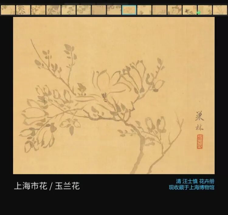 此幅玉兰图,风格清秀淡雅,静态之中尤见玉兰舒展娟丽之姿,充满生意,为上海博物馆收藏的清代著名画家、书法家、诗人、“扬州八怪”之一的汪士慎《花卉册》之玉兰。
