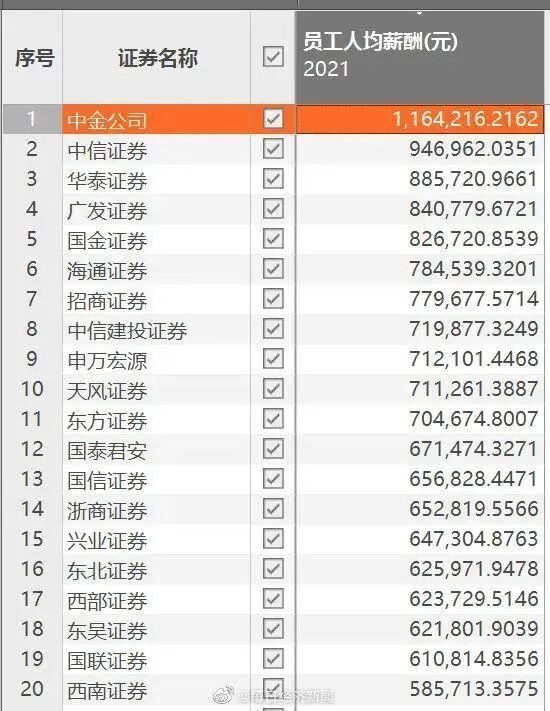 Wind数据显示,人均薪酬方面,2021年中金公司以98.30万元的人均薪酬水平排名第一。中信证券、广发证券紧随其后,人均薪酬分别为89.37万元、82.97万元。