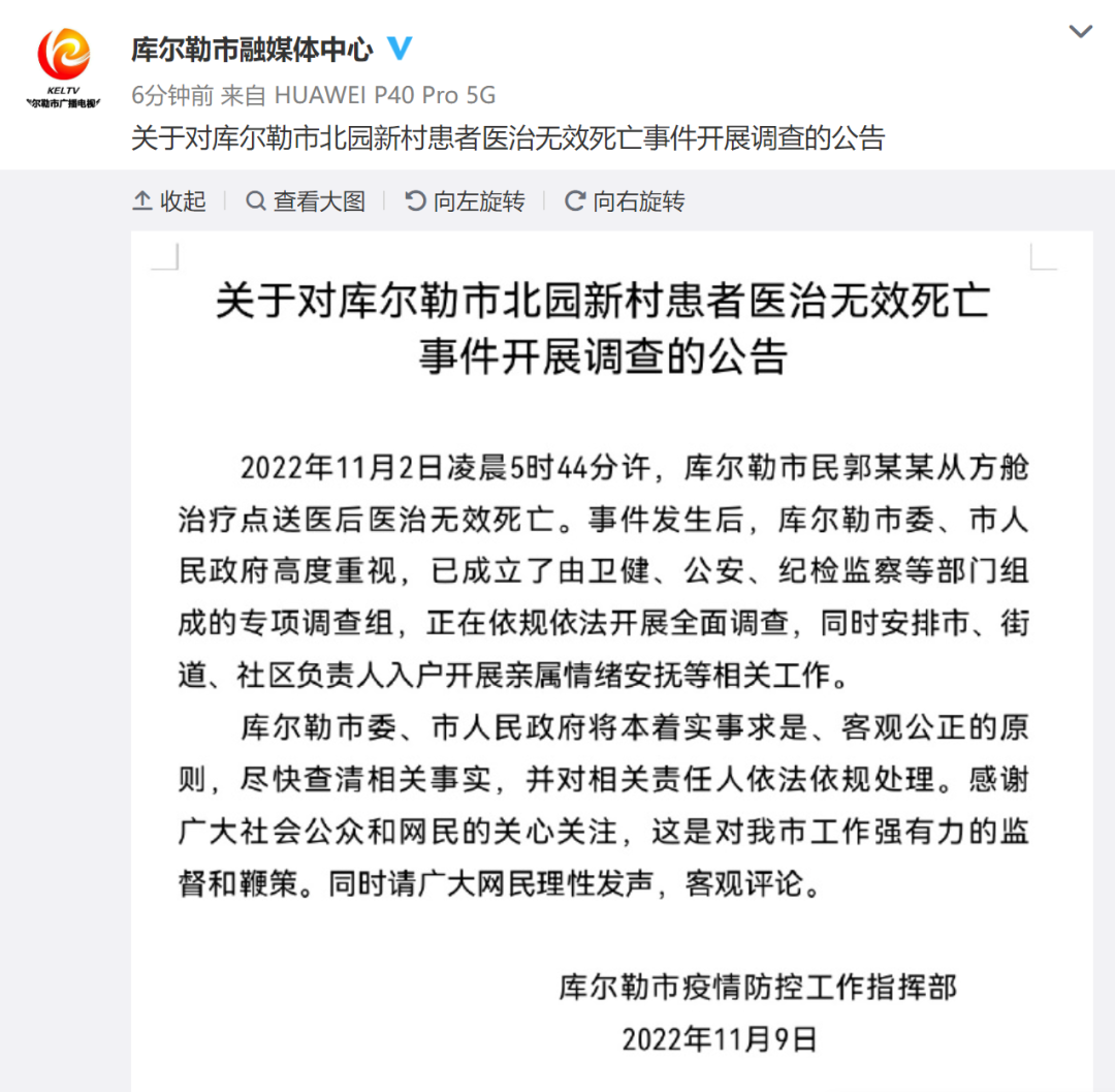 2022年11月2日凌晨5时44分许,库尔勒市民郭某某从方舱治疗点送医后医治无效死亡。事件发生后,库尔勒市委、市人民政府高度重视,已成立了由卫健、公安、纪检监察等部门组成的专项调查组,正在依规依法开展全面调查,同时安排市、街道、社区负责人入户开展亲属情绪安抚等相关工作。