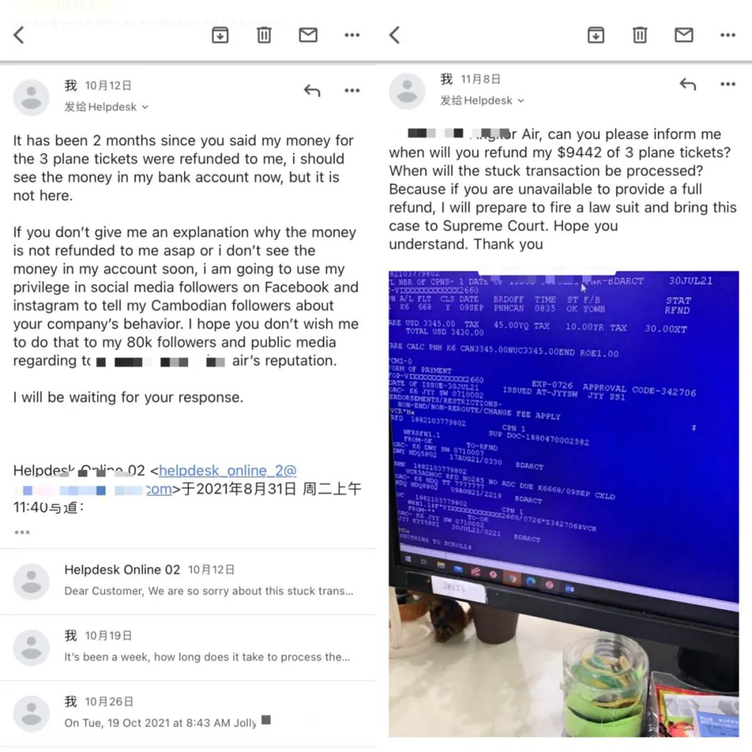 后来,李欣在旅行社那里购买了柬埔寨航空9月8日飞往成都的机票。在回国前,李欣希望能尽快拿到上次机票的$9442退款,于是便前往了某航司在柬埔寨的公司总部。