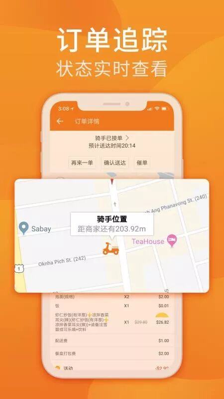 柬单点有自己的骑手和专业的调度人员负责商品的配送。点餐时你可以看到送达时间,还能在APP上看到骑手的位置,棒棒棒~(偷偷告诉你,小编超喜欢观察骑手的位置,小小的图标在移动,好像美食在慢慢靠近,那种感觉就是看到幸福要来啦!)