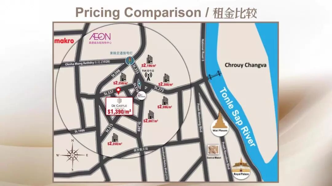 靠近永旺森速分店和万客隆商场,门庭近处就有现代超市巴荣超市。附近还有Chip Mong 集团开发的大型商厦在建当中。沿街各色国际美食餐厅、休闲咖啡馆。同区有英语国际学校、汉语国际学校,孩子就学放心方便。