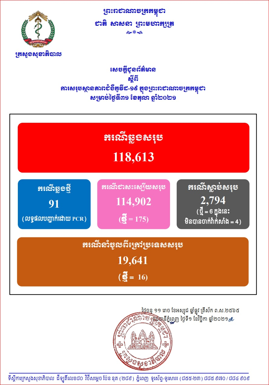 11月1日,教育、青年和体育部发布通告,金边公立、私立学校5000多名教师经过梭酸检测,结果18人确诊。