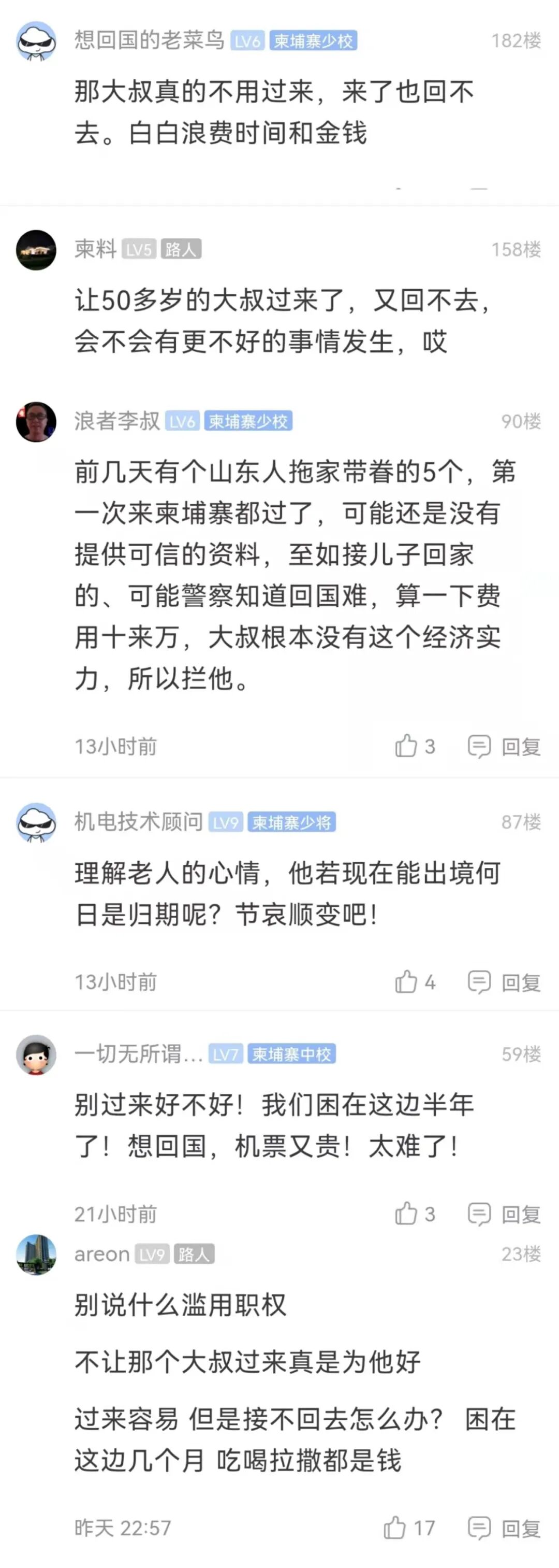 陈强说,这趟航班至少有一半的人都被劝返了,其中一名被劝返的50多岁大叔赴柬原因最令人心酸惋惜。
