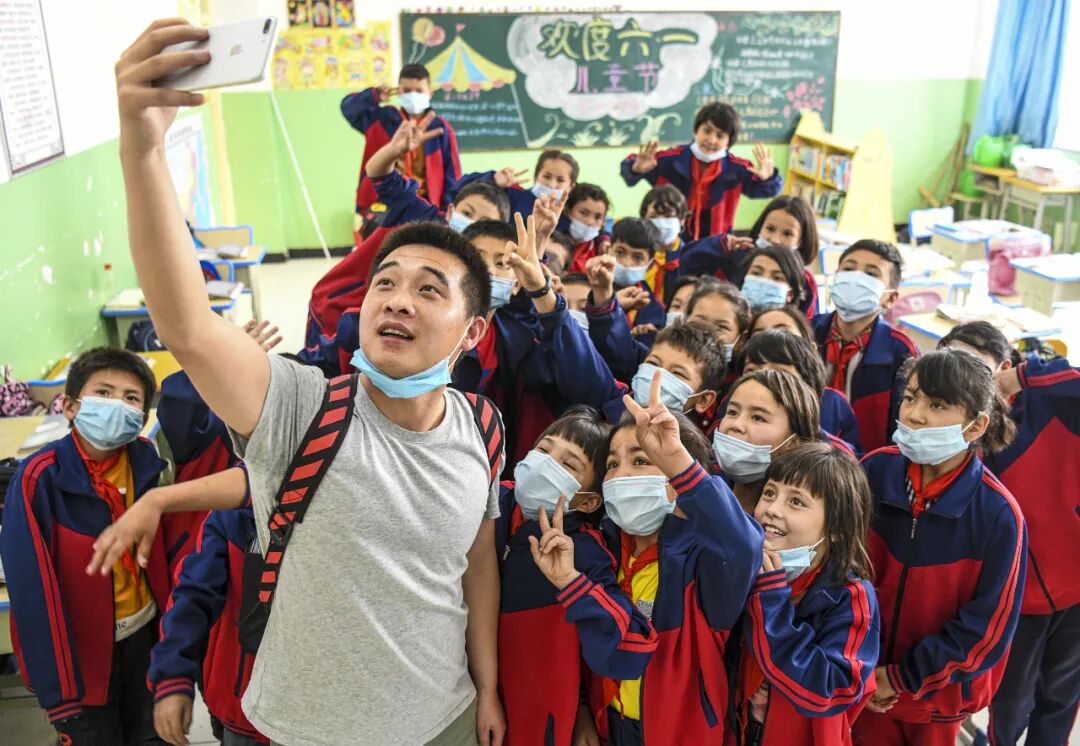 △2020年5月18日,在新疆和田县塔瓦库勒乡巴克墩小学,支教老师马坤和学生们在一起。新华社记者 王菲 摄