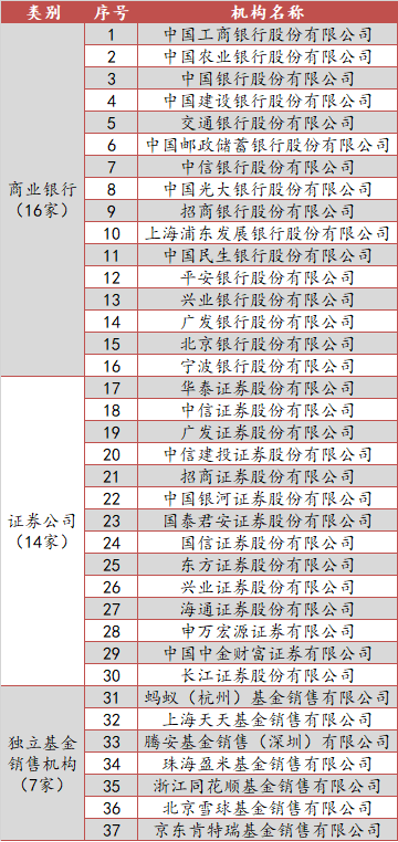 首批入围个人养老金基金销售的基金销售机构共计37家,其中商业银行16家、证券公司14家、独立基金销售机构7家。具体名单如下表所示: