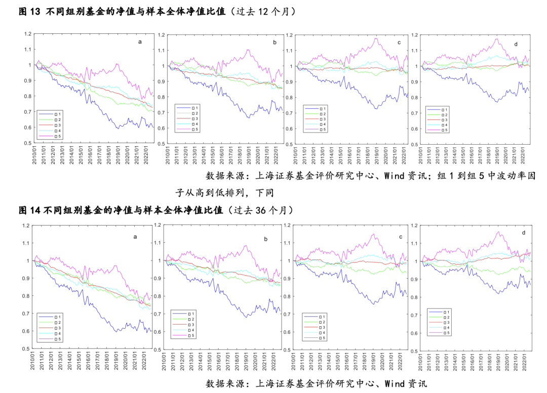 从长期结果来看,在基金风险暴露水平相近的情况下,波动率对未来收益有显著的预测性,波动率最高的产品长期累积收益率最低,波动率最低的产品长期累计收益率最高,意味着在中国资本市场中获取长期收益注重控制风险的重要性;但短期来看,波动率对未来收益的预测性也很强,但在不同市场环境中方向完全不同,在下跌和震荡市场中,呈现反向变化,而上涨市场中,呈现正向变化。过去波动率对未来波动率和最大回撤的预测性更强,且体现出极强的延续性,表中显示,较短的考察期和较短的持有期的延续性略强,不同组别之间的波动率和最大回撤差异最大。