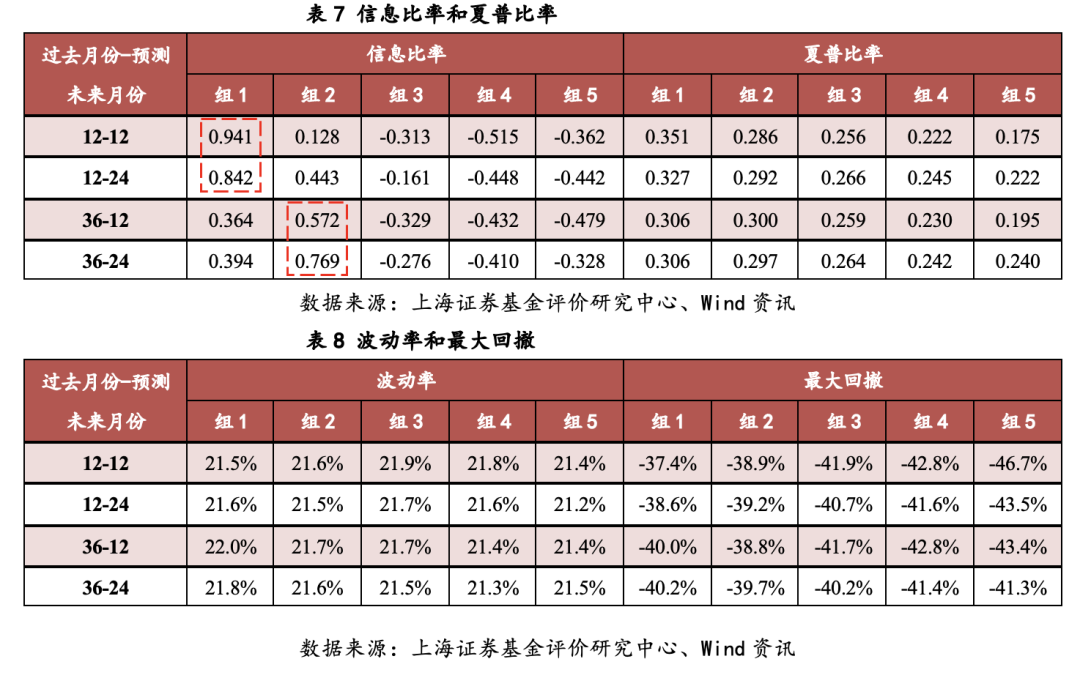 性价比指标采用夏普比率进行检验,夏普比率其实考察了风险和收益两个维度。结果显示,夏普比对未来收益的预测性相对显著,不同组别基金的分层效果更为明显,显示出高夏普比基金较强的超额收益获取能力,表中过去夏普比率高的基金组合的信息比率都有明显提升。夏普比对波动率完全没有预测性,但对最大回撤有一定预测作用,显示出夏普比高的基金整体上具有较好的极端风险控制能力。