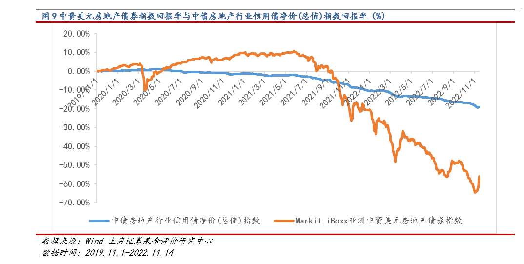 随着美债利率抬升,中资美元债的到期收益率上升。截至 2022 年 11月 14 日,Markit iBoxx亚洲中资美元债券指数、投资级别债券指数、高收益债券指数到期收益率分别为 7.63%、6.20%和24.77%,相对今年年初分别提升 3.58%、3.34%和11.61%。我们认为当前中资美元债收益率已处于历史高位,值得投资者关注,不过也要注意主体的违约风险。