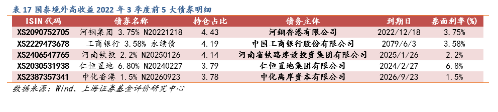 基金 2022 年三季报披露的前五大重仓债券全部为中资美元债,持仓占比为22.24%。