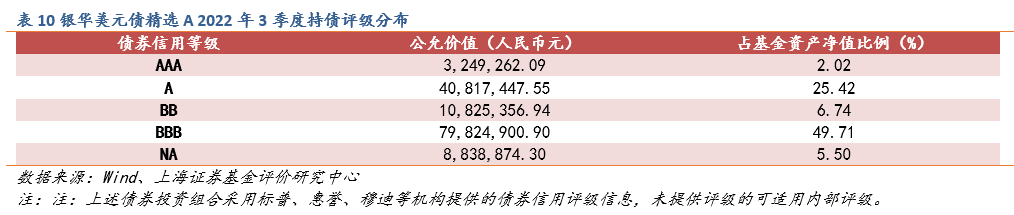 2022 年三季报显示,该基金主要投资于BBB-至A+级债券,占基金资产净值比例为74.67%。