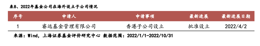 截至2022年10月,有1家基金公司获得批准设立,为泉果基金(2022年2月8日正式成立);1家获得第一次受理反馈,为联博基金。