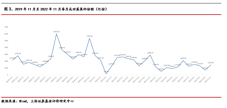 2、从募集规模的结果来看,11月总募集规模1451.95亿份较10月(672.41亿份)大幅反弹,上升幅度达131.68%,但较去年11月下降23.89%。10月受国庆假期及各地疫情反弹势头影响,总募集规模发生大幅度下降;11月总募集份额虽然强势回弹,但仍弱于去年同期,整体处于历史三年平均水平。11月募集份额前三类型分别为:债券基金973.16亿份,指数基金326.30亿份,混合基金106.51亿份。其中,债券基金自今年8月起一直蝉联募集榜首。