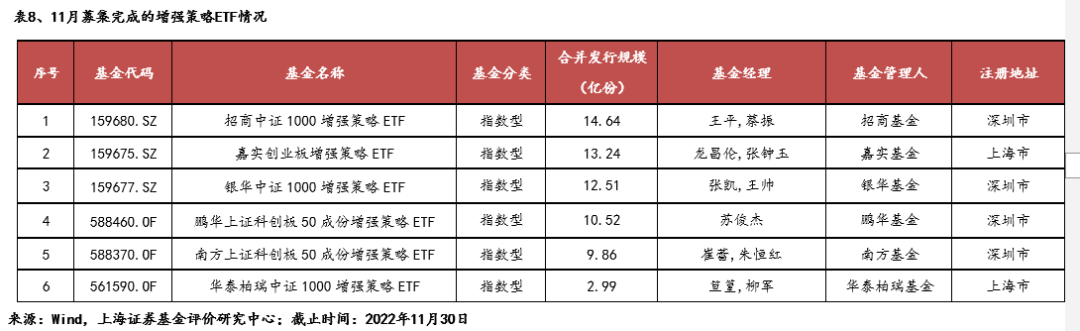 1)部分第二批增强策略ETF募集完成。10月第二批增强策略ETF迎来获批,共有14只基金;11月完成募集的有6只,合并募集规模在2.99-14.64亿元不等。指数增强基金是指数投资为基底、主动管理做增强收益的一类基金。基础目的是通过复制跟踪指数的部分特征从而获取市场本身的收益(β收益);延伸目的是通过基金经理一系列主动的管理,获取超越市场的、额外的收益(α收益),从而争取市场下跌时跌幅比标的指数少、市场上涨时获取相较跟踪标的更多的收益。增强策略ETF则是将增强策略基金和ETF交易模式相结合,即采用增强策略且在场内交易的基金,兼具了前者“主动”的特征及后者流动性强、交易便利的特点。继去年11月首批5只增强策略ETF产品获批之后,基金公司再次密集布局该类产品且标的指数更加丰富:去年获批的基金均为沪深300与中证500指增ETF,而此次获批的增强ETF涵盖了沪深300、中证500、中证1000、科创50等主流指数。本次增强型ETF产品的获批,一方面体现了指数基金进一步的创新化发展,有助于提升权益基金的规模;另一方面在传统ETF市场竞争激烈的背景下,结合了主动管理作为增强手段的ETF为基金管理人破局提供了新方向。