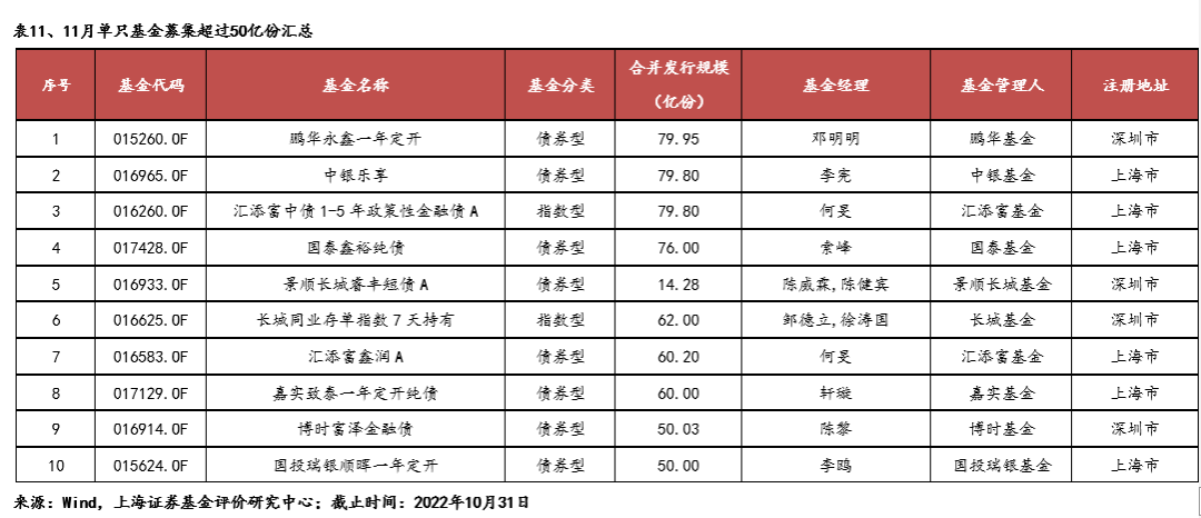 11月单只基金募集大户(超过50亿份)共有10只,均为债券基金或跟踪债券指数的指数基金;较10月(2只)回升明显。根据基金管理人注册地划分,有6家在上海,4家在深圳。