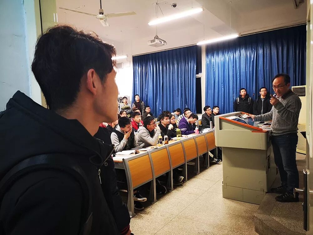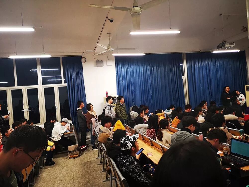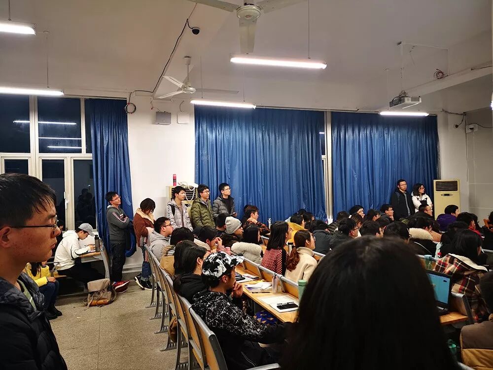 周四晚上7点,武汉大学教5楼的404教室,前门开着,有几个学生站到了走廊里,头朝教室里面看着;后门也开着,却也被几个站着的学生堵上了。从走廊踮脚往里看,教室四周站了一圈学生,手里捧着笔记本;过道里也坐着学生,抱着书包,聚精会神地看向黑板。