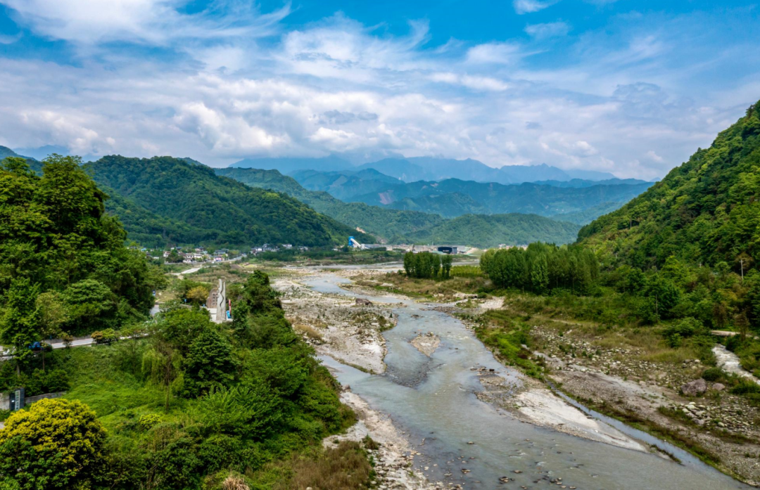 高景关上游的石亭江从群山间缓缓流出。摄影:周乐鹏(新华社签约摄影师)