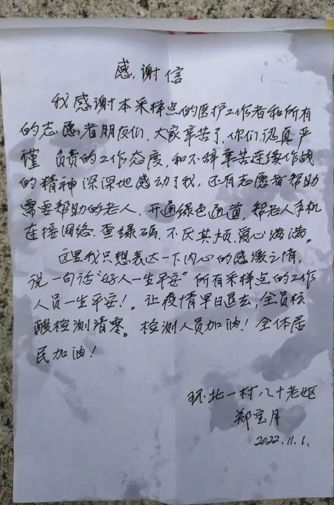 郑宝月老人写给工作人员的感谢信。