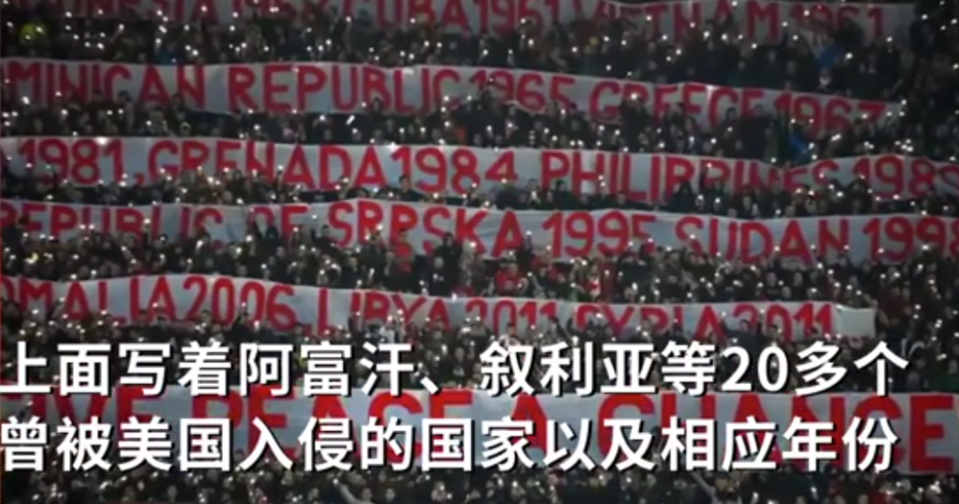 塞尔维亚球迷拉的不是横幅,这是斑斑血泪写成的史书,历史记住了,朝鲜1950年,危地马拉1954年,印度尼西亚1958年,古巴1961年,越南1961,刚果1964,老挝1964年,巴西1964年,多米尼加1965年,希腊1967年,阿根廷1976,尼加拉瓜1981年,格林纳达1984年,菲律宾1989年,巴拿马1989年,伊拉克1991年、2003年,塞族共和国1995,苏丹1998年,南联盟1999年,阿富汗2001年,也门2002年,索马里2006年,利比亚2011年,叙利亚2011年。