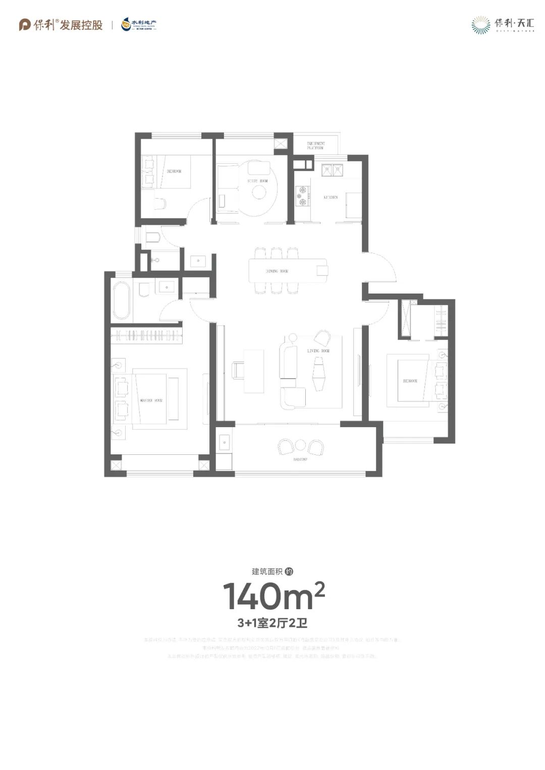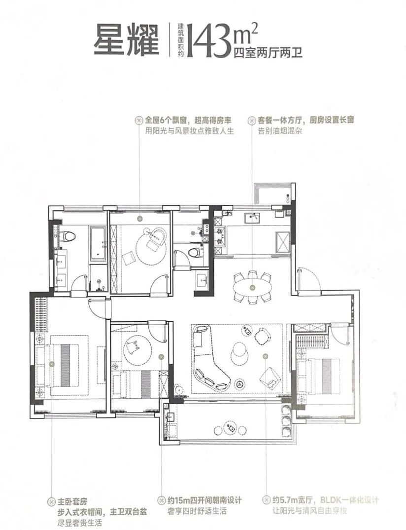 户型最大约143㎡4房2卫,标准的大4房+横厅户型。