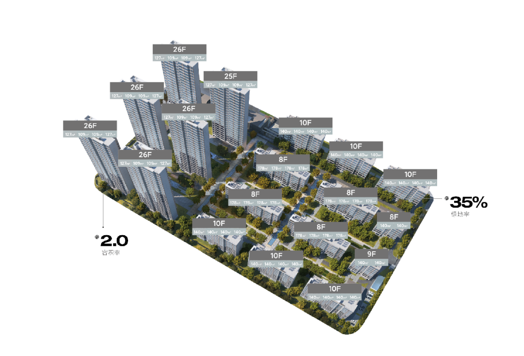 建筑排布上多采用“围合式”布局,清一色大户型改善为主。