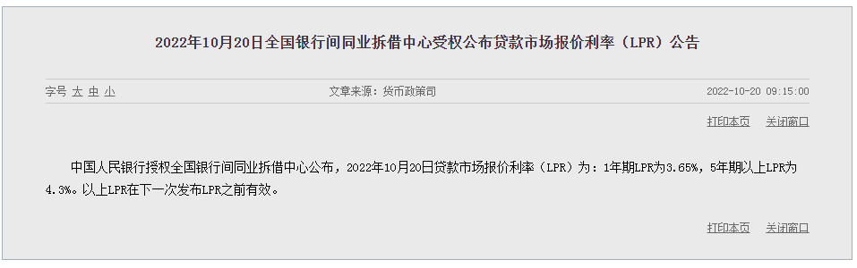 中国人民银行授权全国银行间同业拆借中心公布,2022年10月20日贷款市场报价利率(LPR)为:1年期LPR为3.65%,5年期以上LPR为4.3%。