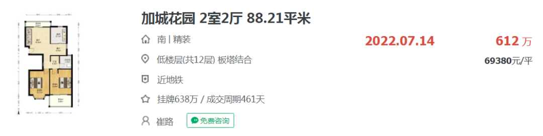 这套88㎡小两居,成交总价612w,折合单价约6.9w/㎡,比小区的挂牌均价高出近8000元+!