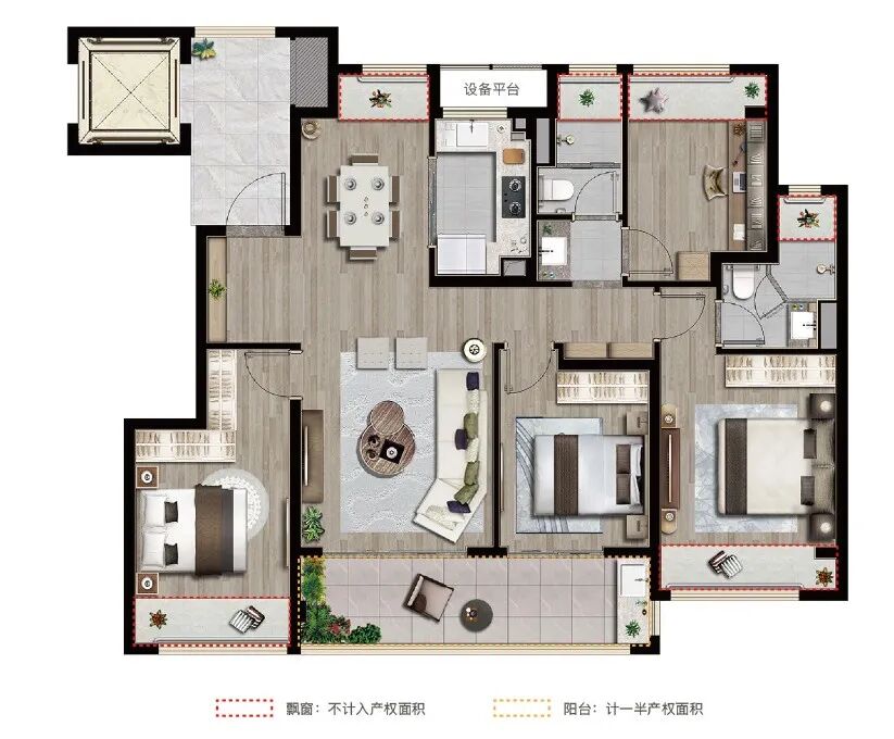 重点看看建面约126㎡4房户型:四开间朝南,全明方正,精装交付!