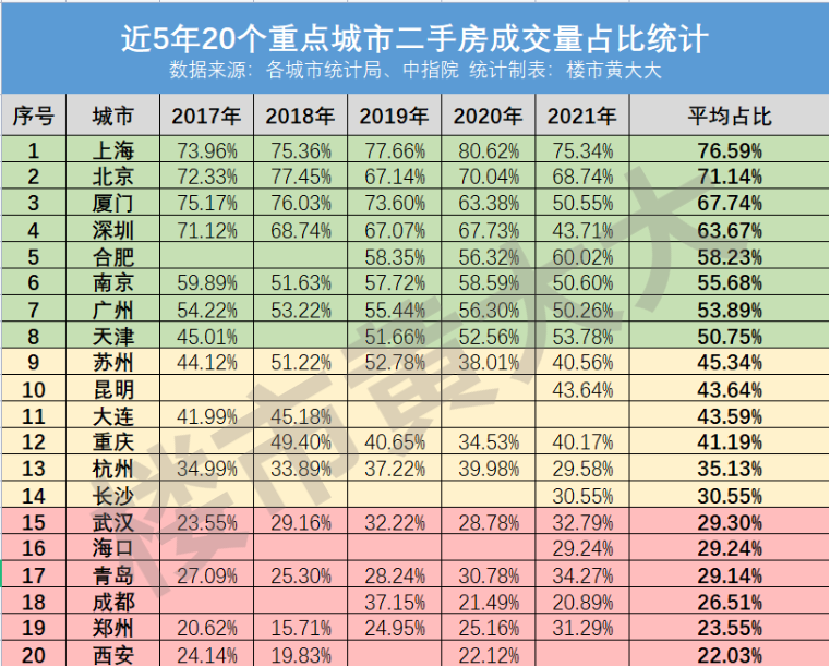 有8个城市近5年二手房成交量平均占比超过50%,底盘最扎实,一线城市都在其中。排序依次是上海、北京、深圳、广州。