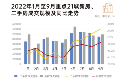 据统计,今年1-9月,重点21城二手房共成交9210万平方米,同比下降25.3%。新房成交面积1.01亿平方米,同比降幅达到40.2%。