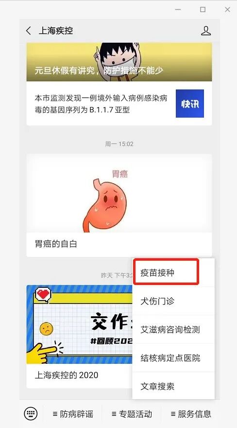1. 关注“上海疾控”微信公众号,点击服务信息-疫苗接种-新冠疫苗接种服务;或登录随申办,也可以直接下载/并实名注册健康云App。(如未实名,按下述操作过程中会提示完成)