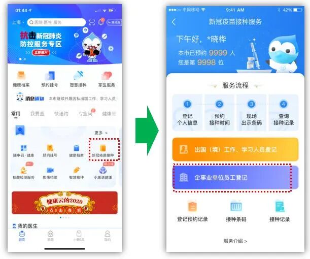 2. 进入“新冠疫苗接种服务”专区,选择“企事业单位员工登记”。
