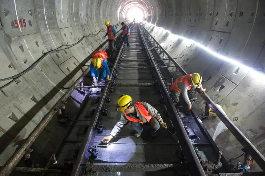 2018年4月30日,地铁4号线茶子山区段,工人正在进行抹面作业。当日,地铁4号线一期工程河西段实现轨通。