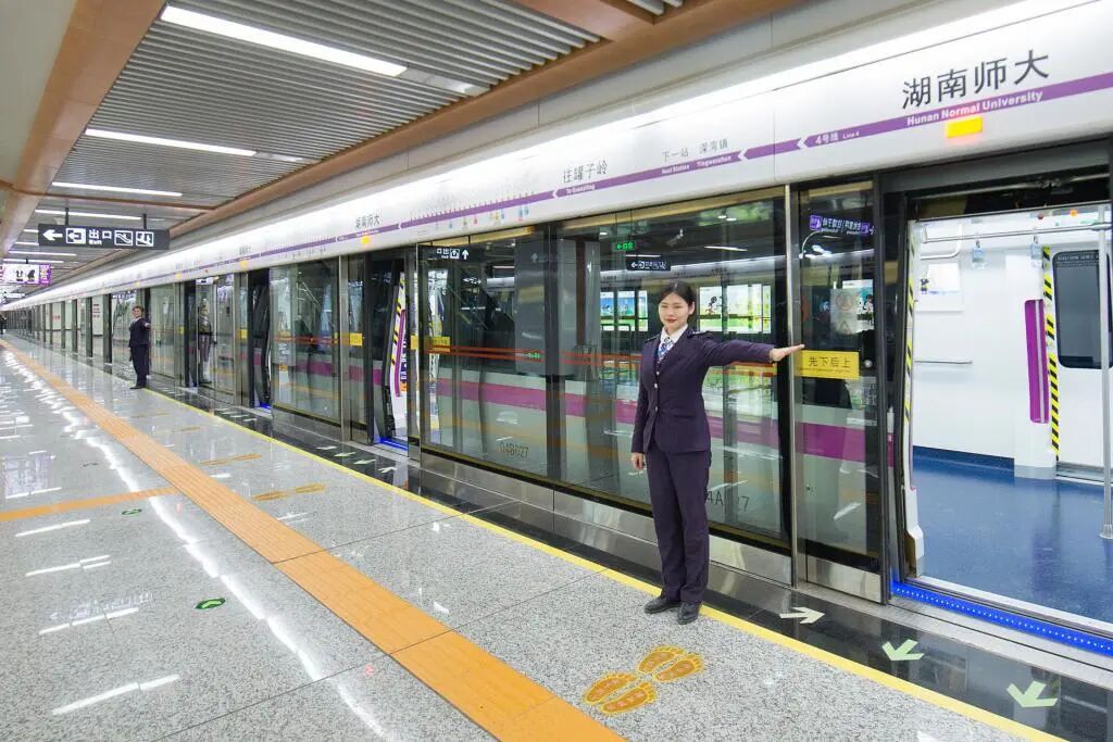 2019年5月7日,长沙地铁4号线湖南师大站,站务员正按试运行标准接发列车。5月26日,该线路正式投入试运营。4号线一期工程全长33.5公里,设站25座,均为地下车站。线路北起罐子岭南至杜家坪,呈西北至东南走向,串联望城区、岳麓区、天心区、雨花区和长沙县,途经滨江新城、溁湾镇商业中心、岳麓山大学城、南湖新城、高铁新城、黄榔副中心等重要城市功能中心和枢纽地带。