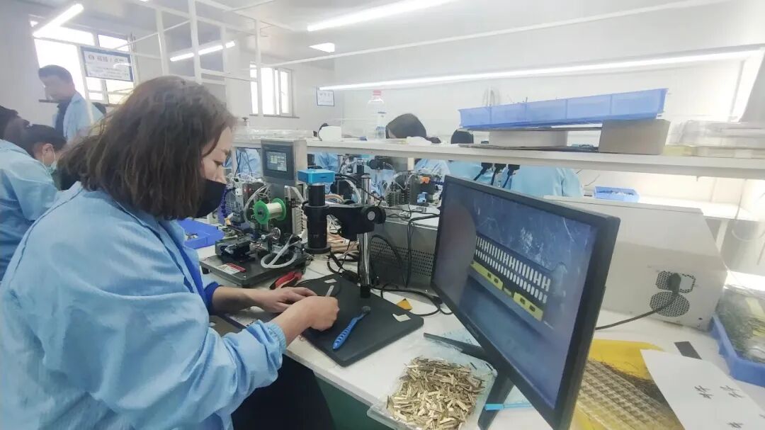在沁源县泰达电子有限公司生产车间,常丽峰拿起线材,对准连接器PIN针,眼睛紧盯电脑显示屏,双手灵活地在细若发丝的铜线上轻勾细点。然后放到氩焊机上,“刺啦”一声,青烟腾起,金属端口牢牢焊妥。