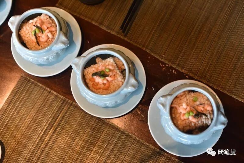 值得一讲的是主食,两块四四方方的锅巴,就是“原初良田恩泽四方”了吧。上面放几粒虾仁。妙就妙在用高汤亦即鸡汤先冲淋。