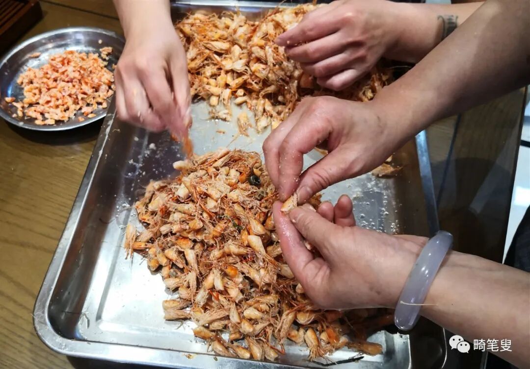 于是,我们走向斜对面的御面斋。一进门,就看见有人在剥虾仁虾脑虾籽。