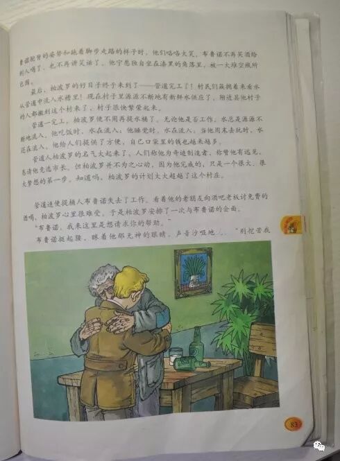 故事的开始出现在教科书的第81页,故事梗概——意大利的一个小村子里,柏波罗和布鲁诺是村长任命的两个运水的人,布鲁诺很满意这样的工作,然而柏波罗却要修建一条管道,因为他觉得每天运水太辛苦,他已经想到了自己运不动的那一天。