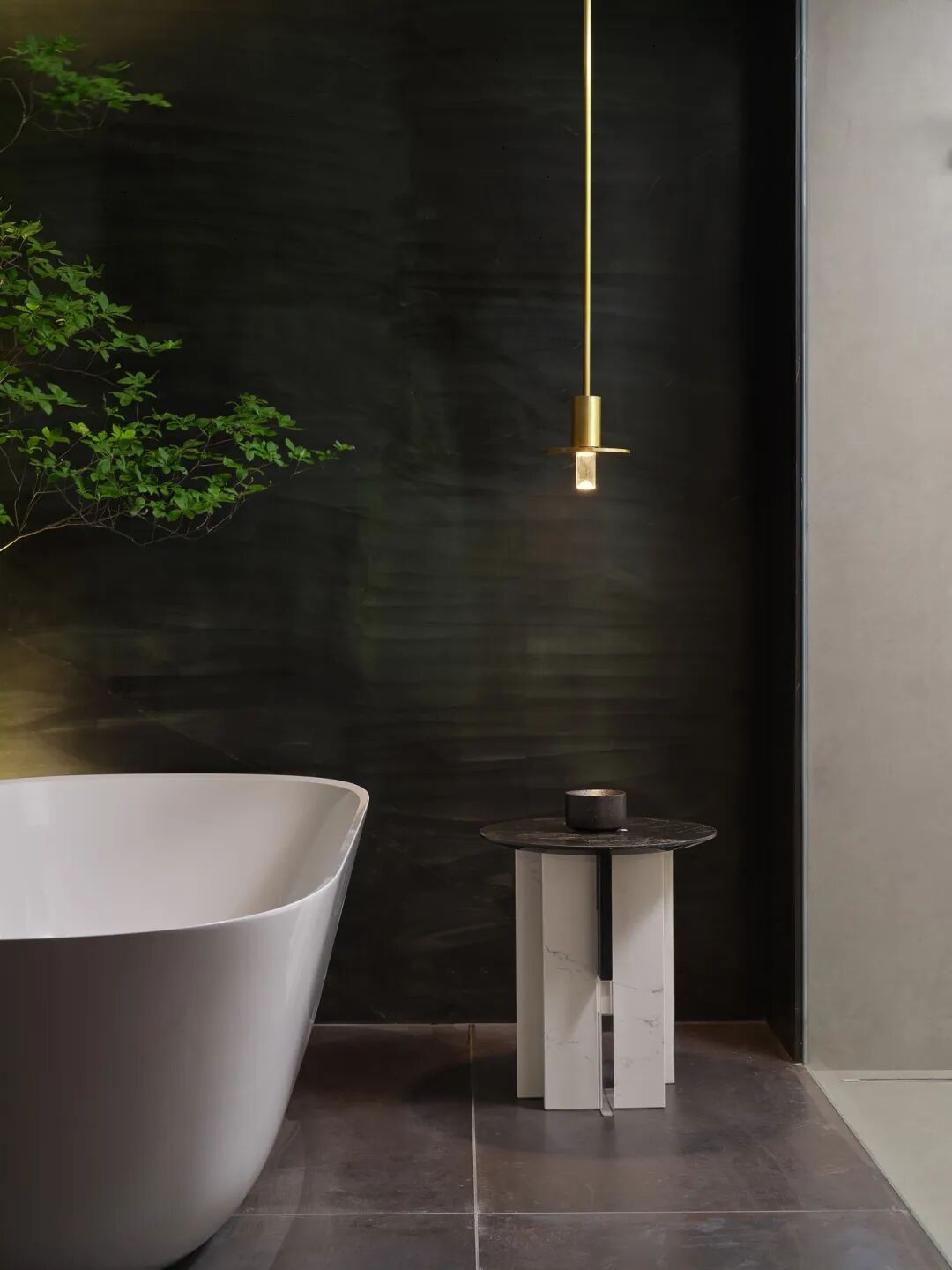 特殊的灯光设计旨在与简约的材料形成对比。火山石和大理石粉灰泥为空间提供了均匀的色调和经久的美感,光线在不同纹理的表面上形成微妙的反射。