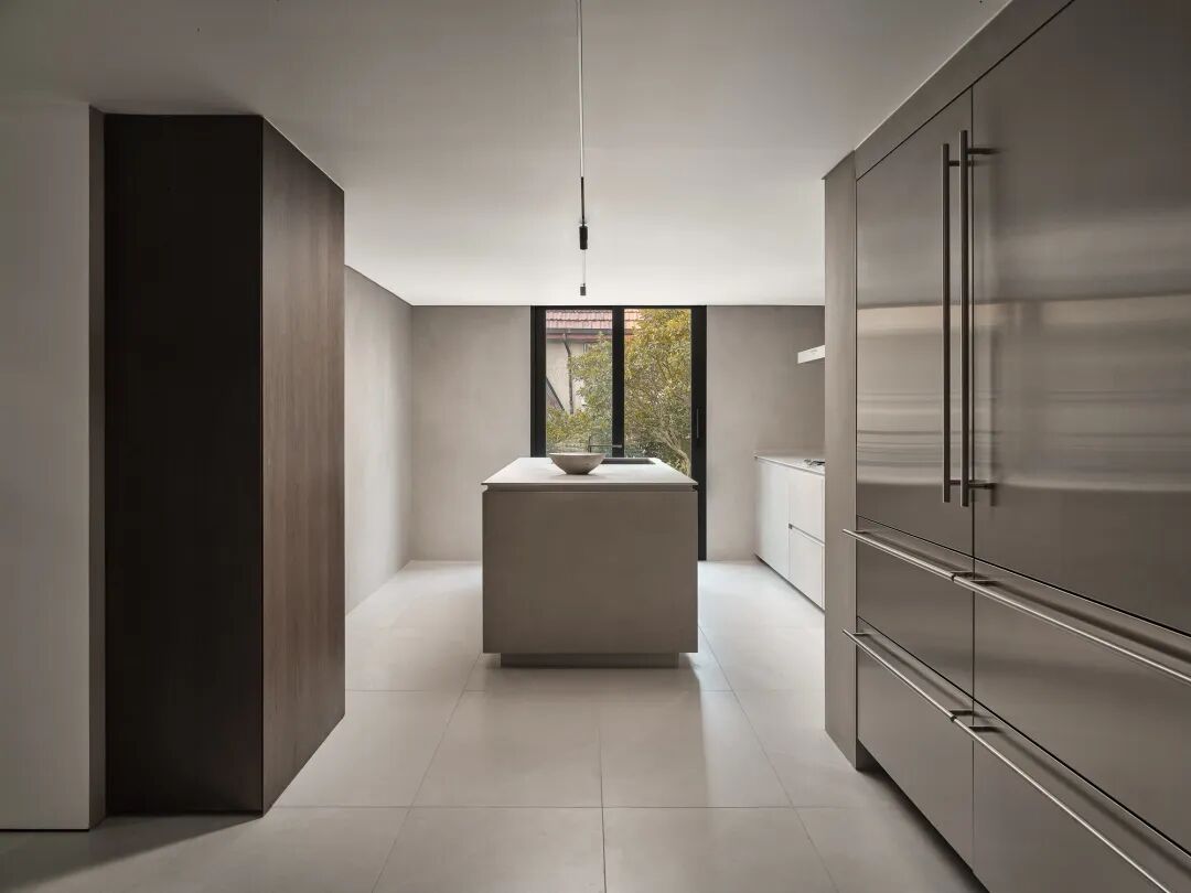 餐桌上方悬挂着一组不规则鹅卵石状的磨砂玻璃吊灯,旁边是日光室和暖灰色的单色厨房。厨房位于步入式衣橱下方,虽然天花高度受到限制,但位于高天花的餐厅和日光室的行道树影间,仿佛两个区域之间的一次呼吸,身处其中全然没有压抑之感。
