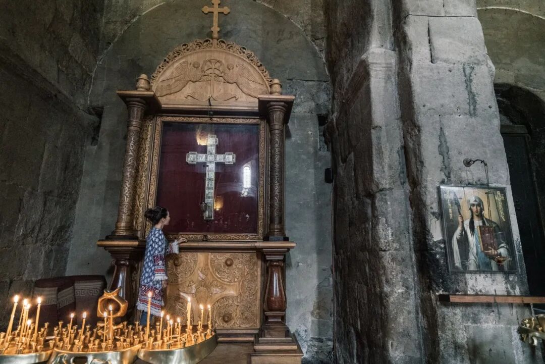传说当年圣尼诺用自己的头发把两根弯弯曲曲的葡萄藤绑在一起做成了特有的双臂下垂的十字架,从此成了格鲁吉亚特色。这个有着1600多年历史的十字架如今存放在第比利斯的锡安主教座堂(Sioni Cathedral),而圣尼诺的墓地就在西格纳吉的博德修道院(Bodbe Monastery),也值得去看一眼。