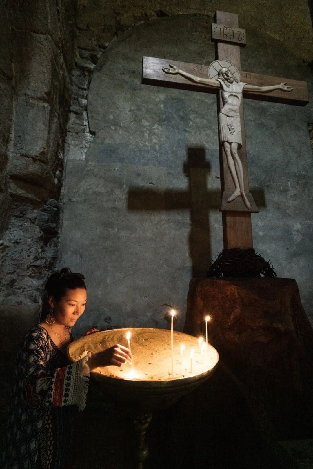 这座教堂跟圣尼诺也有关系,传说四世纪的时候她在山顶的这个地方,竖起了一座大十字架,这个十字架能创造奇迹,吸引了很多朝圣者。两百年后的公元545年,人们给十字架修建了一座教堂,后来又经过扩建。据说当年圣尼诺的那个十字架,依然有部分残留在这座教堂里,有许多信徒来此献蜡烛献花。